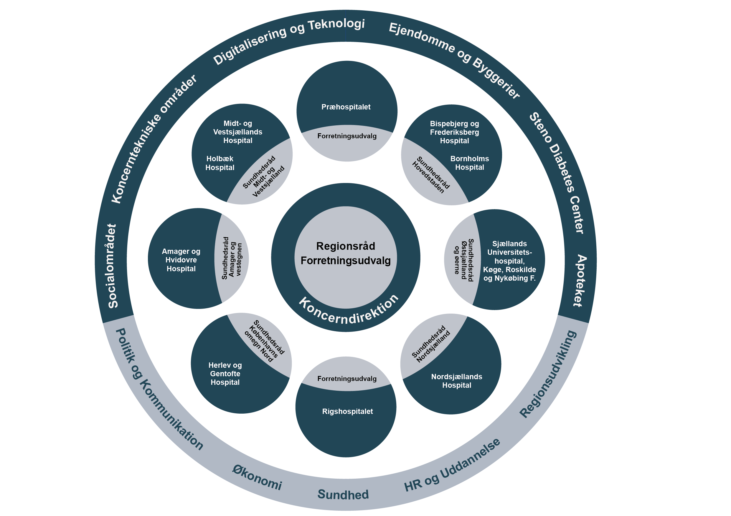 Udover regionens hospitaler og de nye sundhedsråd, er Region Østdanmark organiseret i en række koncerndriftsområder og tværgående koncernstabe.